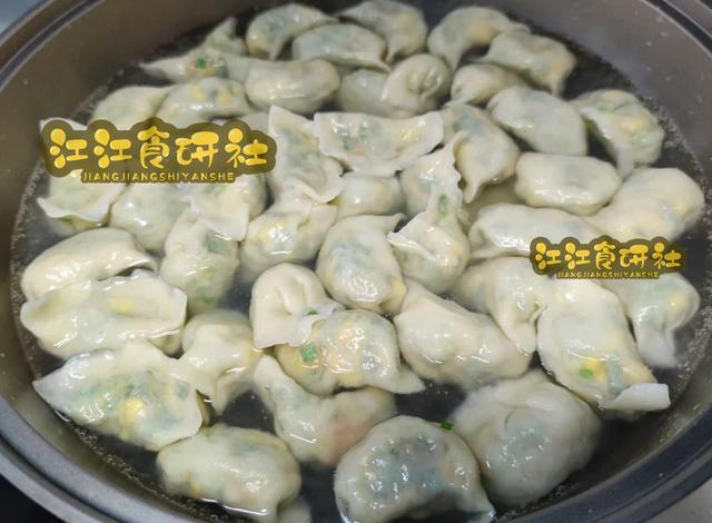 4、包饺子:取饺子皮,放入馅料,可在每个饺子里都放入一段完整的虾仁,寓意“圆满”。捏紧收口,沸水下锅,点两次水,煮至饺子全部鼓胀浮起即可。