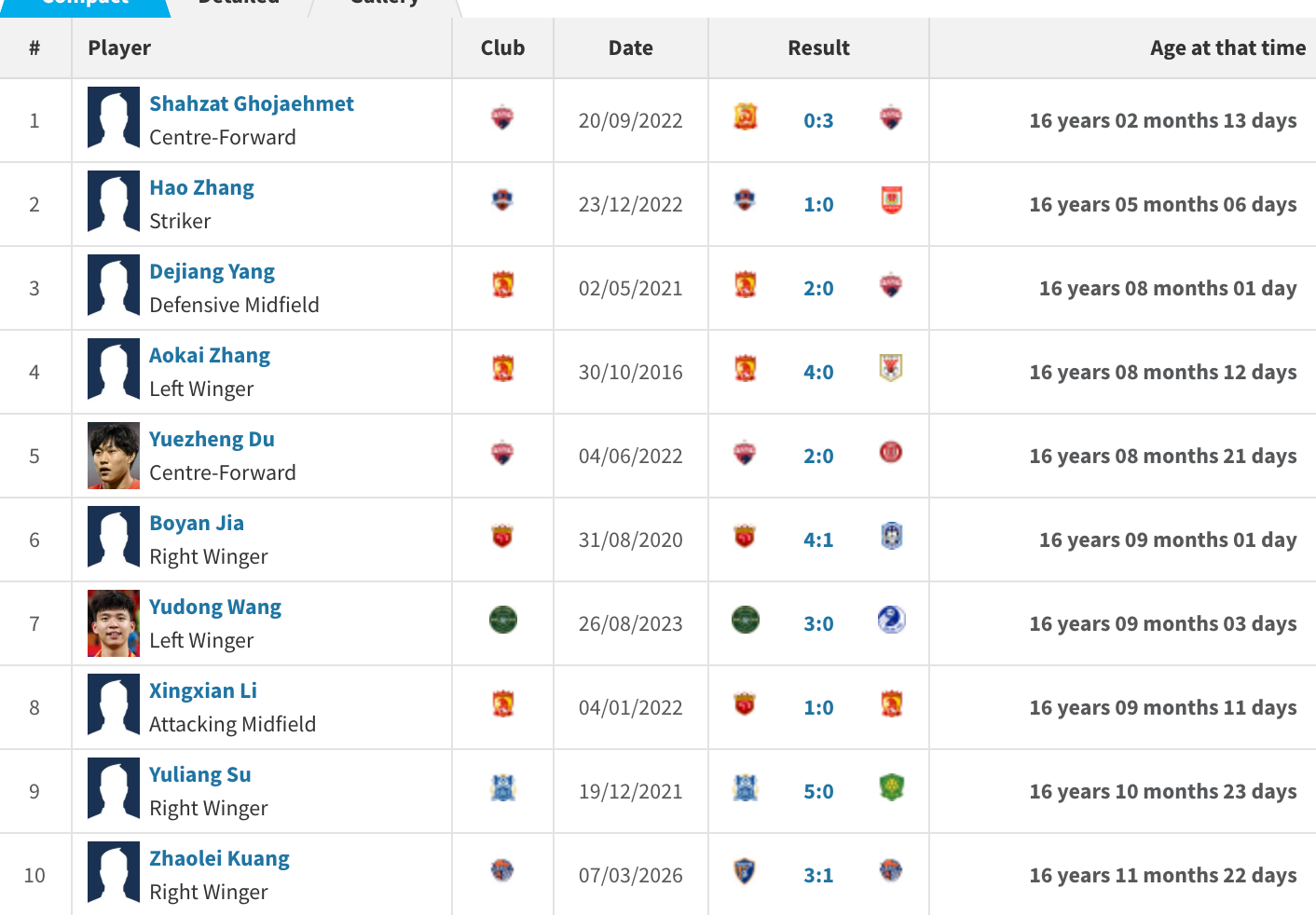 中超历史最年轻首秀球员Top10: