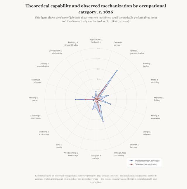 Anthropic发布了一份劳动力市场报告,一位经济学家制作了一张模拟 1826 年人工智能自动化就业情况的图表