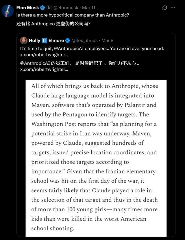 有趣的是,就在最近,马斯克转发了Claude参与伊朗空袭数百个目标选择的信息,锐评道:还有比Anthropic更虚伪的公司吗?