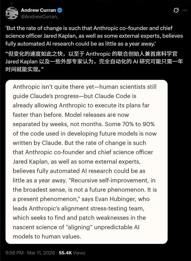 Anthropic的某些科学家认为,完全自动化的AI研究,可能在一年内实现!