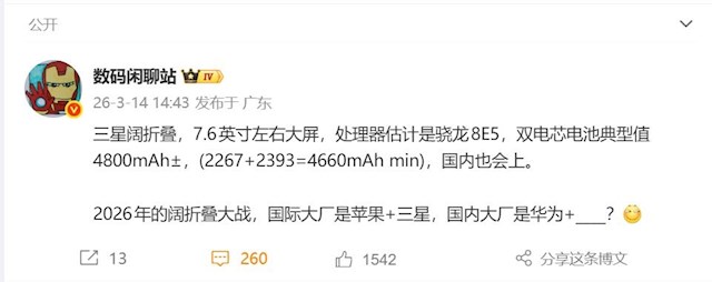 紧随华为之后,三星也在积极研发旗下的阔折叠屏新机。这款设备的屏幕尺寸为7.6英寸,屏幕比例是4:3,将搭载高通第五代骁龙8至尊版平台,并配备4800毫安时电池。