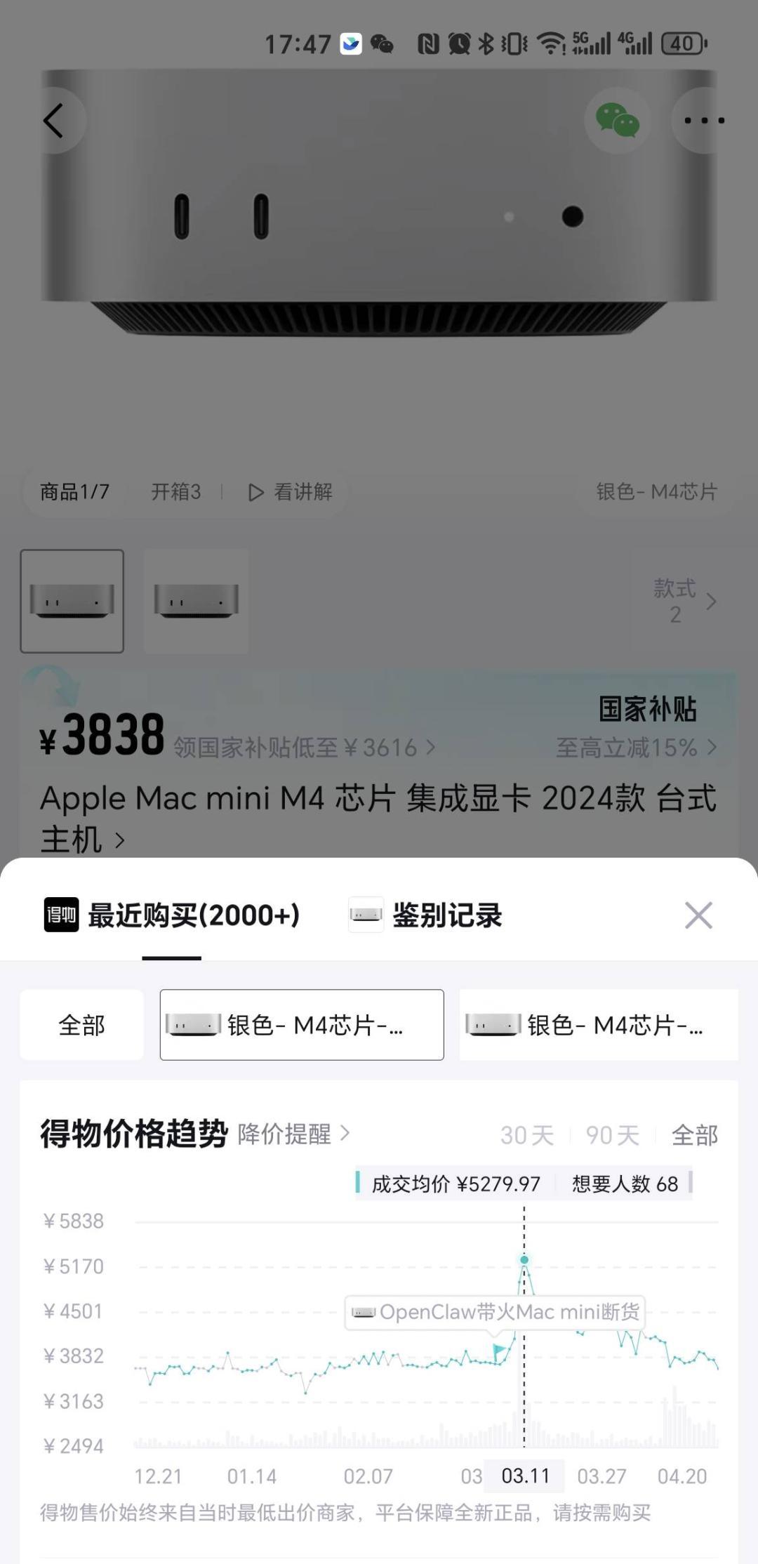 其实从得物App数据可佐证,Mac mini M4(16GB+256GB)市场价格已从3月11日的5279.79元高点回落至4月20日的3663.15元,一个多月内下跌约1615元,跌幅超过30%。其他配置也同步回调:16GB+512GB版本从6574元降至5679元,较高点下跌910元;24GB+512GB版本则从8999元回落至7744元。